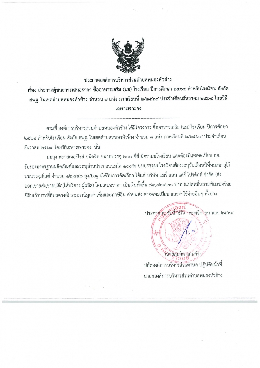 ประกาศองค์การบริหารส่วนตำบลหนองหัวช้าง เรื่อง ประกาศผู้ชนะการเสนอราคา ซื้ออาหารเสริม (นม) โรงเรียน ปีการศึกษา 2564 สำหรับโรงเรียน สังกัด สพฐ. จำนวน 7 แห่ง ภาคเรียนที่ 2/2564 ประจำเดือนธันวาคม 2564 โดยวิธีเฉพาะเจาะจง