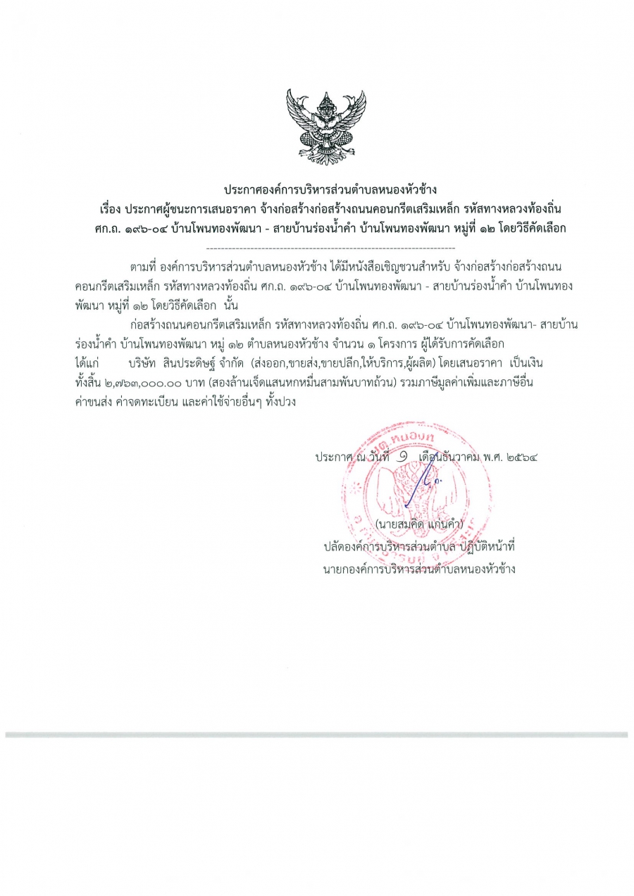 ประกาศองค์การบริหารส่วนตำบลหนองหัวช้าง เรื่อง ประกาศผู้ชนะการเสนอราคา จ้างก่อสร้างถนนคอนกรีตเสริมเหล็ก รหัสทางหลวงท้องถิ่น ศก.ถ. 196-04 บ้านโพนทองพัฒนา - สายบ้านร่องน้ำคำ บ้านโพนทองพัฒนา หมู่ที่ 12 โดยวิธีคัดเลือก