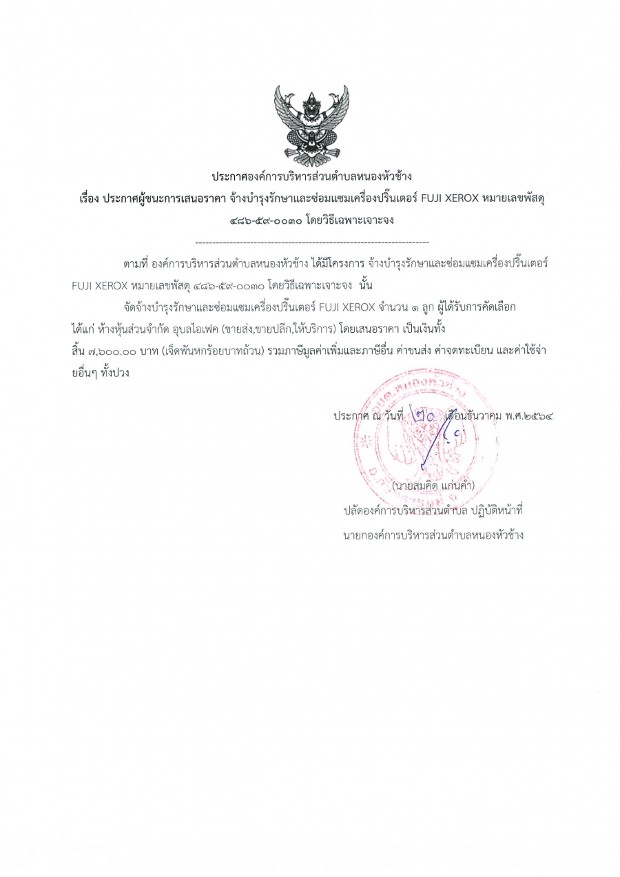 ประกาศองค์การบริหารส่วนตำบลหนองหัวช้าง เรื่อง ประกาศผู้ชนะการเสนอราคา จ้างบำรุงรักษาและซ่อมแซมเครื่องปริ้นเตอร์ FUJI XEROX หมายเลขพัสดุ 486-59-0030 โดยวิธีเฉพาะเจาะจง