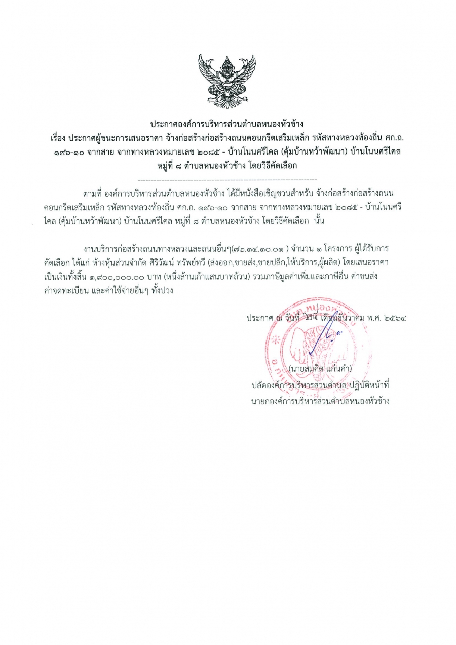 ประกาศองค์การบริหารส่วนตำบลหนองหัวช้าง เรื่อง ประกาศผู้ชนะการเสนอราคา จ้างก่อสร้างถนนคอนกรีตเสริมเหล็ก รหัสทางหลวงท้องถิ่น ศก.ถ.196-10 จากสายทาง ทางหลวงหมายเลข 2085-บ้านโนนศรีไคล (คุ้มบ้านหว้าพัฒนา) บ้านโนนศรีไคล ม. 8 ตำบลหนองหัวช้าง โดยวิธีคัดเลือก