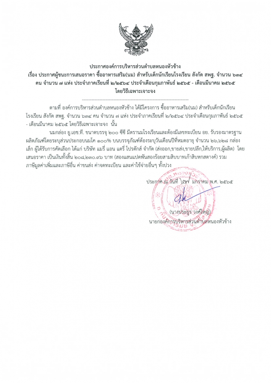 ประกาศองค์การบริหารส่วนตำบลหนองหัวช้าง เรื่อง ประกาศผู้ชนะการเสนอราคา ซื้ออาหารเสริม (นม) สำหรับนักเรียนโรงเรียน สังกัด สพฐ. จำนวน 634 แห่ง จำนวน 7 แห่ง ประจำปีภาคเรียนที่ 2/2564 ประจำเดือนกุมภาพันธ์ 2565-เดือนมีนาคม 2565 โดยวิธีเฉพาะเจาะจง