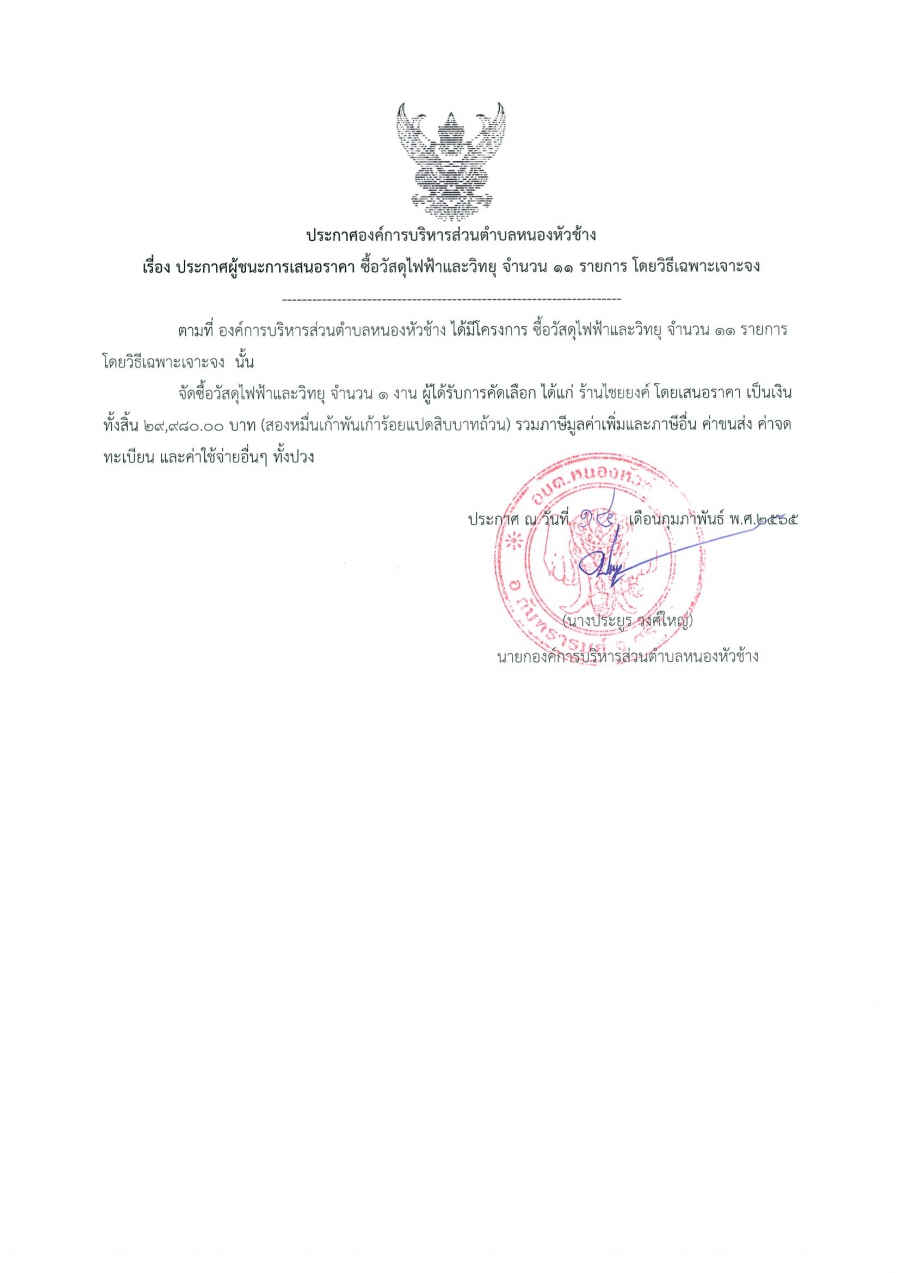 ประกาศองค์การบริหารส่วนตำบลหนองหัวช้าง เรื่อง ประกาศผู้ชนะการเสนอราคา ซื้อวัสดุไฟฟ้าและวิทยุ จำนวน 11 รายการ โดยวิธีเฉพาะเจาะจง