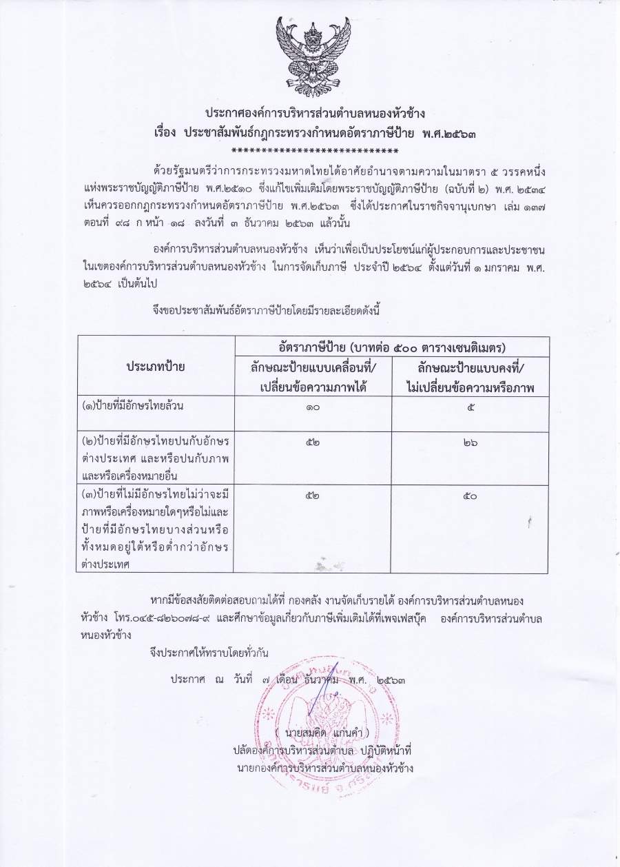 ประกาศองค์การบริหารส่วนตำบลหนองหัวช้าง เรื่อง ประชาสัมพันธ์กฎกระทรวงกำหนดอัตราภาษีป้าย พ.ศ. 2563 วันจันทร์, 07 ธันวาคม 2563 10:58 Print Email ประกาศองค์การบริหารส่วนตำบลหนองหัวช้าง เรื่อง ประชาสัมพันธ์กฎกระทรวงกำหนดอัตราภาษีป้าย พ.ศ. 2563 back to top