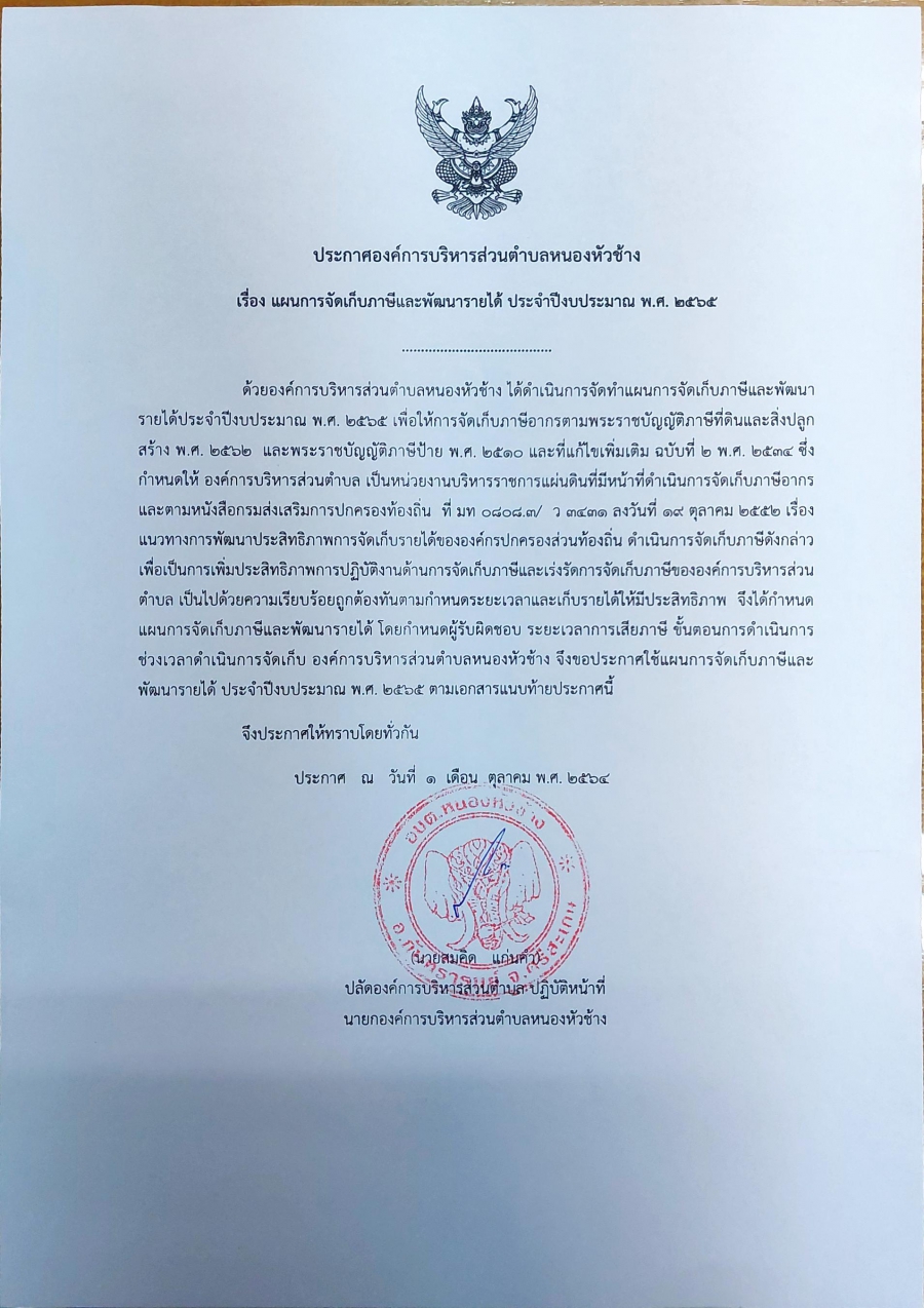 ประกาศองค์การบริหารส่วนตำบลหนองหัวช้าง เรื่องแผนการจัดเก็บภาษีและพัฒนารายได้ ประจำปีงบประมาณ พ.ศ. 2565